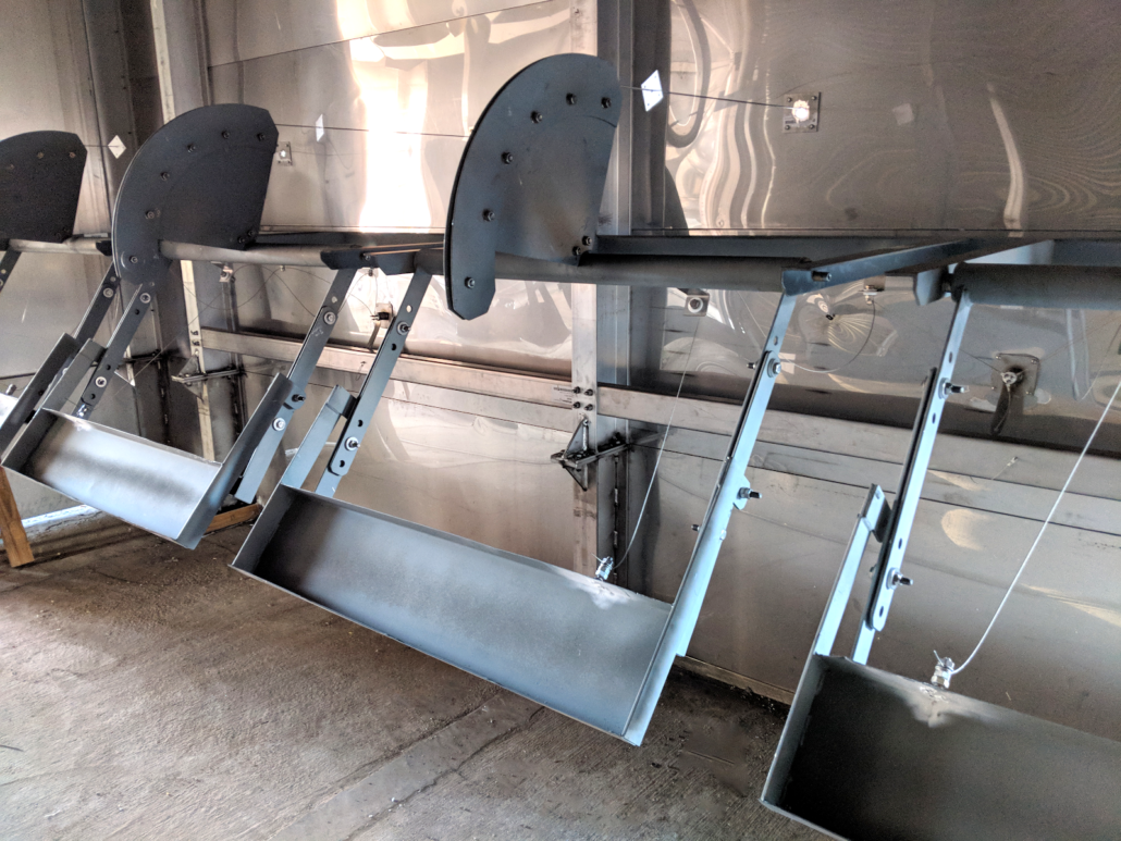 The arms are shown in the lowered position which allows the lumber to move unimpeded. Once the lumber stops moving, the arms are automatically raised and the blades on the outer edge of the arms make contact with the DryTrack® CDK plates that extend out of the lumber packs roughly 6” to 8”. When the arms are in the raised position (the contact position) they provide the data readings to the DrySpec® CDK control system via serial connection to the PLC from the meters on the outside of the CDK walls.