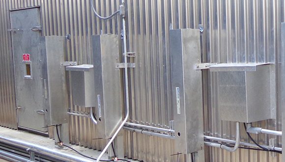 DryTrack® meter cards are installed in aluminum NEMA 4 enclosures on the outside of the kiln walls close to each measuring point.